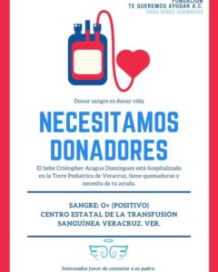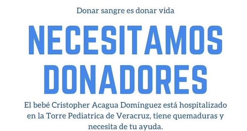 A continuación la solicitud de ayuda: «Necesitamos donadores de sangre para el bebé Cristopher. Por favor, si usted gusta ayudar, comuníquese al Centro Estatal de la Transfusión Sanguínea en Veracruz y saque su cita al no. telefónico 229 927 0580