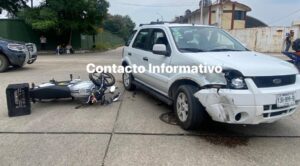 Minatitlán, Ver. Cuantiosos daños materiales, y un conductor de moto que salió disparado desde su vehículo al chocar contra una camioneta, fue el saldo de aparatosa colisión reportada la tarde de este sábado 14 de diciembre en el cruce de las avenida Berlín y calle Panamá, en los límites de las colonias Nueva Mina y Miguel Hidalgo.
