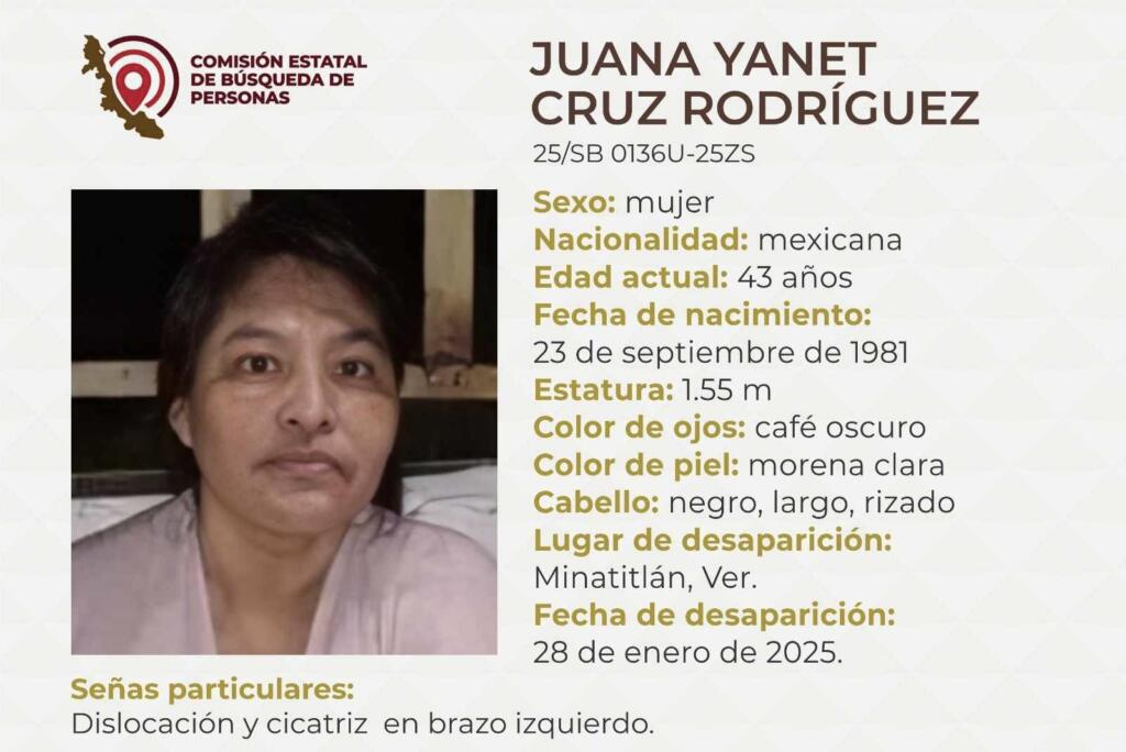 Minatitlán, Ver. Una mujer de 43 años, identificada como Juana Janet Cruz Rodríguez, ha sido reportada como desaparecida desde las primeras horas de este martes 28 de enero.
