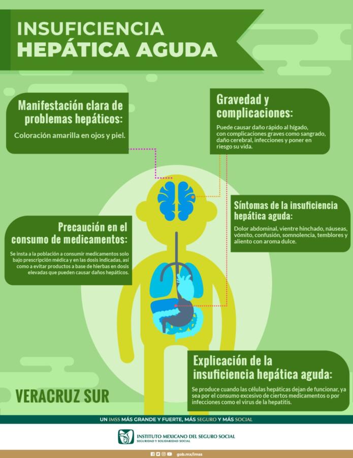 El director del Hospital General de Zona (HGZ) No. 36 de Coatzacoalcos, doctor Omar Antonio García López, explicó que la insuficiencia hepática aguda se produce cuando las células hepáticas ya no funcionan, originado por el consumo excesivo de antiinflamatorios, antibióticos o anticonvulsivos, o bien, causado por el virus de la hepatitis.