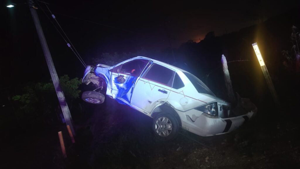 El impacto fue tan fuerte que el automóvil terminó montado sobre los tensores de acero de un poste de la Comisión Federal de Electricidad (CFE), generando alarma entre automovilistas que circulaban por la zona.