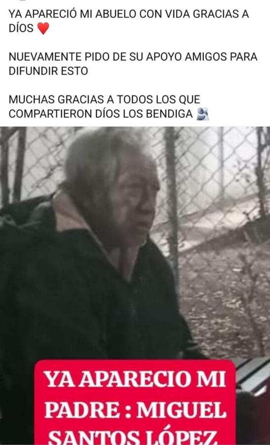 El señor Miguel Santos López de 70 años de edad y vecino de este municipio, ya apareció, luego de haber estado extraviado desde el pasado día 29.