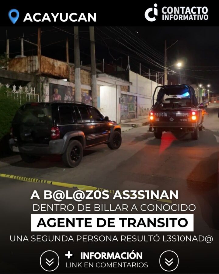 Acayucan, Ver. La tranquilidad del segundo cuadro de la ciudad se vio interrumpida la noche de este lunes, cuando un ataque armado en el interior de un billar ubicado sobre la calle Vicente Guerrero, en barrio Zapotal, dejó como saldo la muerte del agente de Tránsito Santiago Bello Rico y un hombre más gravemente herido, según datos extraoficiales.