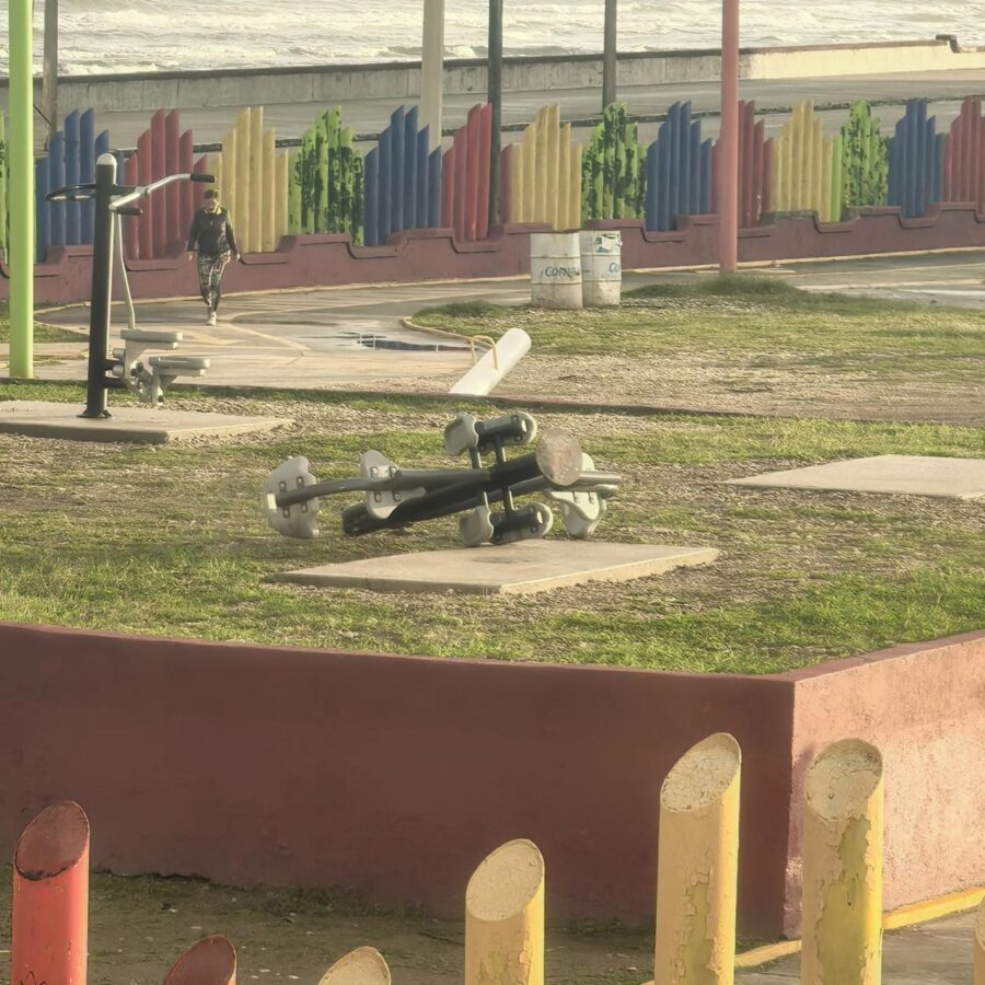 Además, uno de los aparatos para ejercitarse fue derribado, quedando tendido en el suelo, esto a pesar de que aún se encuentra en proceso de ser fijado al concreto.