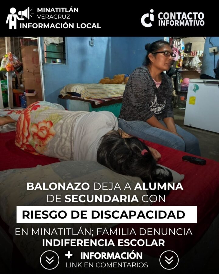 Minatitlán, Ver. El reloj corre en contra para María José N., la estudiante de 13 años de la escuela secundaria general número 1 “Emiliano Zapata”, del ejido Tacoteno, cuya vida dio un giro dramático a principios de octubre. A casi un mes de que la estudiante fue blanco de un severo balonazo en la explanada de la escuela secundaria, cuyo golpe le causó inflamación cerebral, tanto el instituto educativo como la familia del menor presunto responsable siguen sin brindar atención a la adolescente, quien se mantiene inmovilizada, con secuelas y bajo el riesgo de quedar discapacitada.