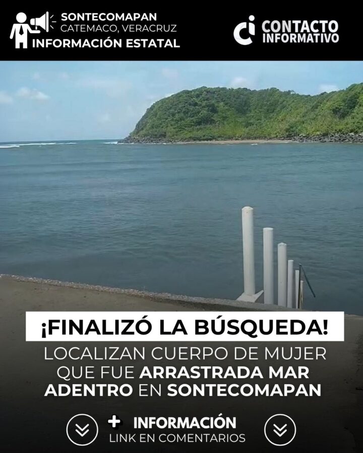La búsqueda por parte de corporaciones de Protección Civil y de pescadores ha finalizado, este lunes 21 de julio por la tarde noche, fue localizado el cuerpo sin vida de la fémina que fuera arrastrada mar adentro en la playa de la Barra de Sontecomapan municipio de Catemaco.