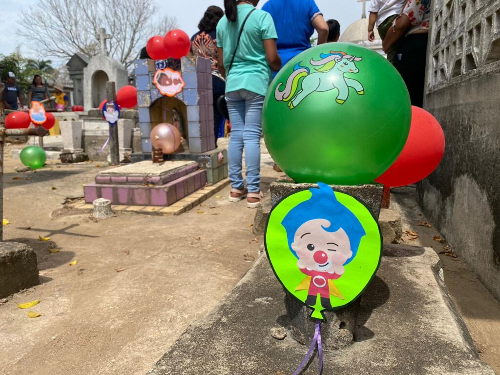 Minatitlán, Ver.-El panteón Santa Clara, se llenó de globos, adornos y mensajes de cariño para los niños que mantienen su descanso eterno, con la llegada de alumnos de la escuela Veracruz con el motivo de llevarles un presente, en el marco de la celebración del “día del niño”, a todas aquellas tumbas que permanecen en el abandono.