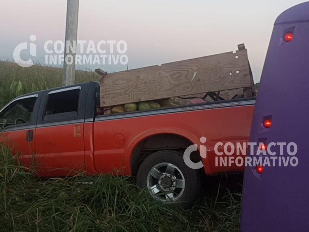 De acuerdo con los reportes preliminares, una camioneta de batea roja cargada con cocos habría impactado por alcance al autobús, provocando que este se volcara sobre su costado izquierdo. El compacto también salió de la carretera tras el golpe.