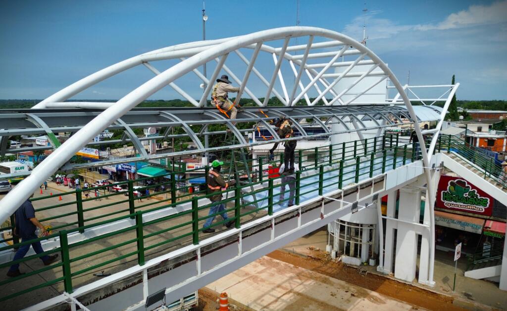 Continúan trabajos de mantenimiento del puente peatonal de Cosoleacaque.