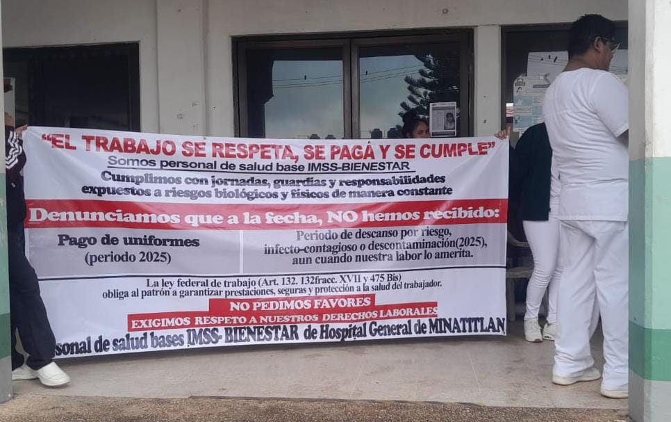Minatitlán, Ver. La inconformidad del personal de salud volvió a hacerse visible este martes en el Hospital General de Minatitlán (HGM), donde trabajadores adscritos al esquema IMSS-Bienestar realizaron una protesta para denunciar atrasos y omisiones en prestaciones laborales que consideran esenciales para el desempeño de su trabajo.