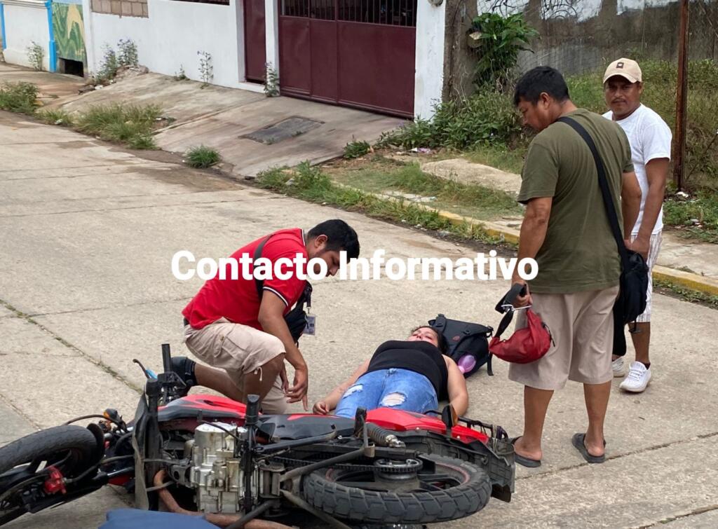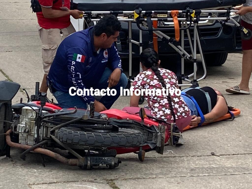 Minatitlán, Ver. Con probable fractura de pierna, terminó una mujer que conducía una motocicleta luego de chocar contra la puerta de un taxi en la colonia Las Delicias.