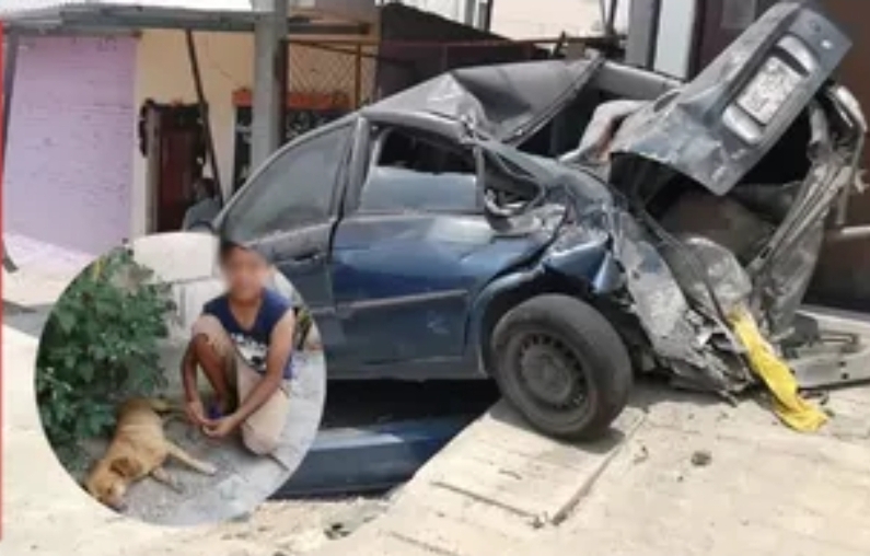 Afortunadamente, el pequeño, de nombre Erick, y su mascota llamado Terry, salieron ilesos, mientras que el camión de volteo destrozó la fachada de una vivienda y un vehículo