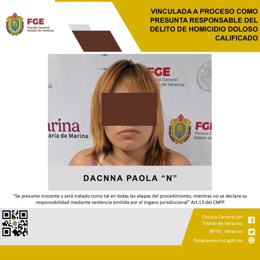 De acuerdo con la Fiscalía Regional Coatzacoalcos obtuvo vinculación a proceso en contra en su contra, como presunta responsable del delito de homicidio doloso calificado en agravio de las víctimas identificadas con las iniciales A.A.M.V., C.L.L.C. y una persona hasta el momento no identificada.
