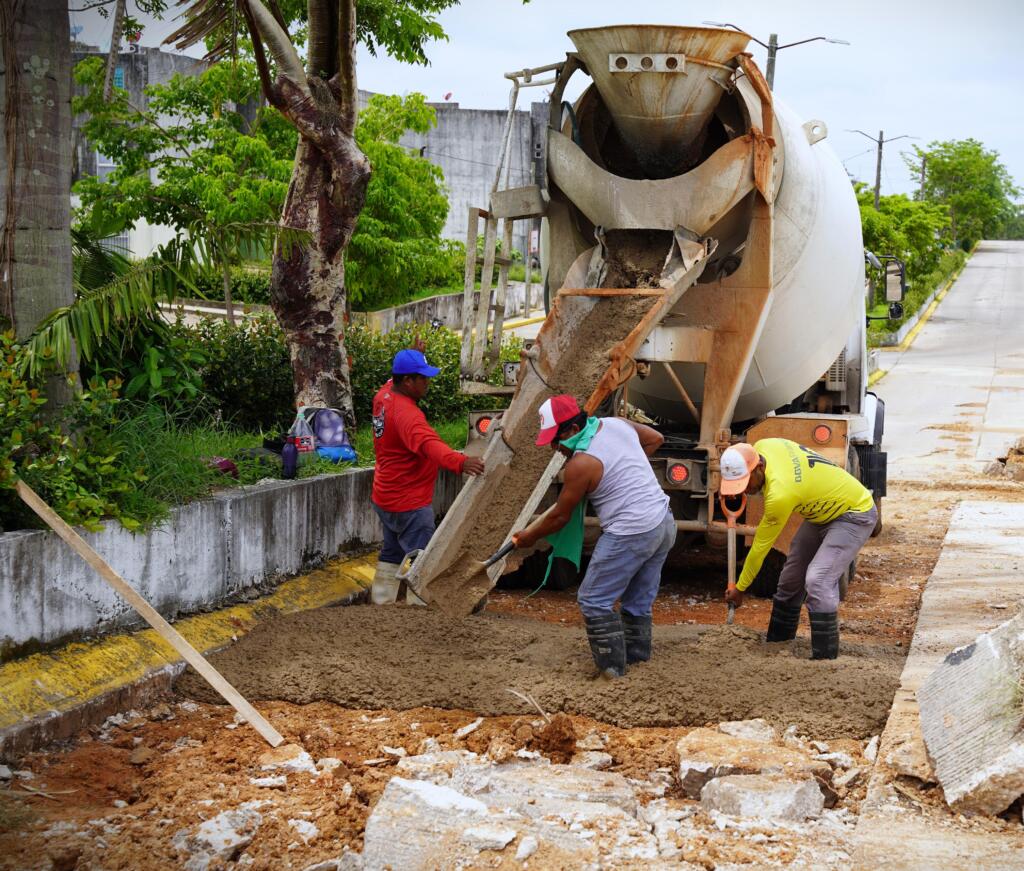 El H. Ayuntamiento de Cosoleacaque repara losas de concreto en el Fraccionamiento Los Mangos.
