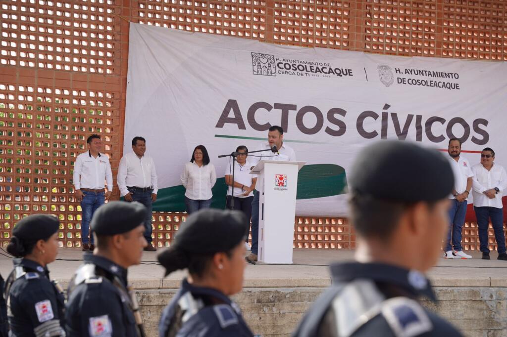Con mucho orgullo y fervor patrio, el cabildo de Cosoleacaque, encabezado por el presidente municipal Ponciano Vázquez Parissi, empleados de confianza y sindicalizados rindieron honores a la bandera en el parque central Miguel Hidalgo, contando en esta ocasión con la participación especial de docentes de la Escuela Primaria Miguel Alemán Valdez, del Fraccionamiento los Mangos.