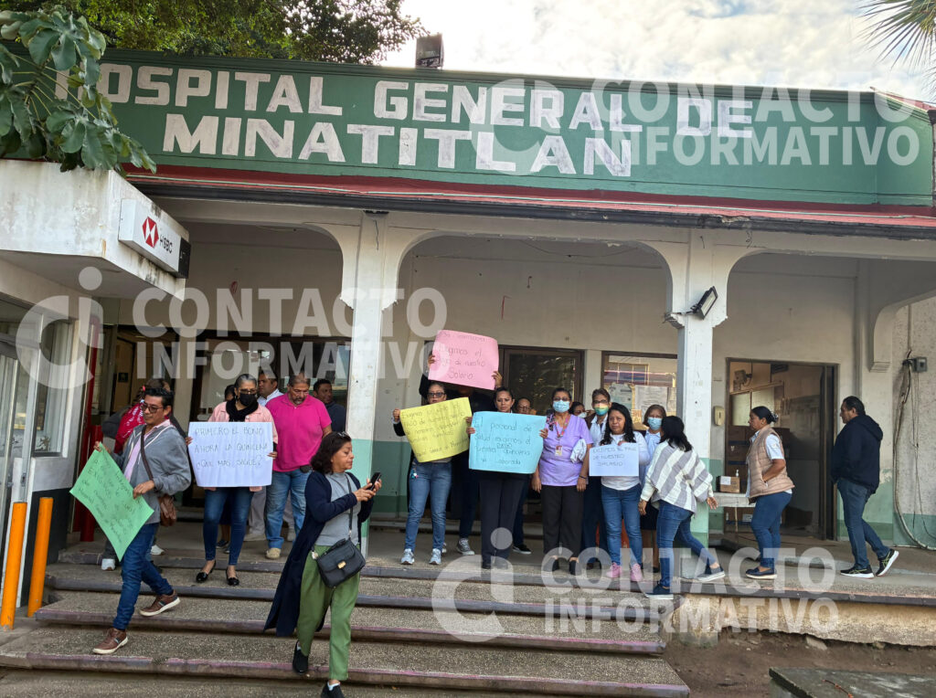 Trabajadores del sector salud se manifestaron la mañana de este viernes en el municipio de Minatitlán, luego de no recibir el pago de la quincena correspondiente al 15 de enero, situación que afecta a personal del Centro de Salud y del Hospital General de Minatitlán (HGM).