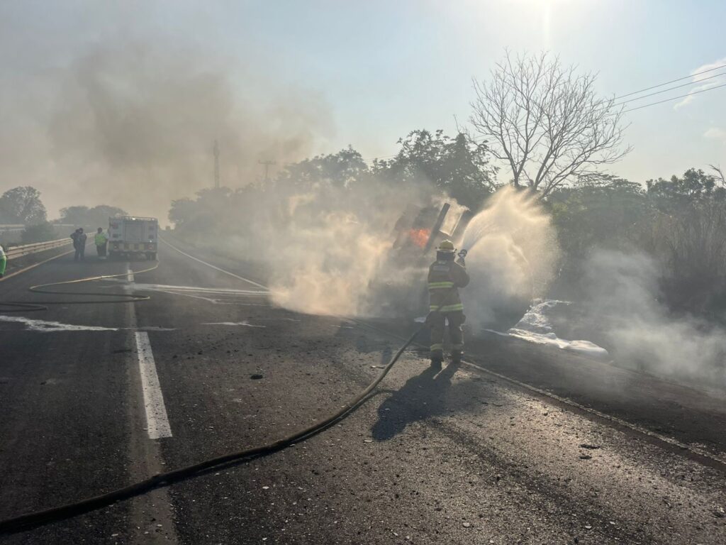 El siniestro se registró a la altura del kilómetro 25, en inmediaciones del puente Zaragoza, donde la pesada unidad salió del camino por razones aún no esclarecidas. La emergencia movilizó de inmediato a cuerpos de rescate y elementos del cuerpo de bomberos, quienes lucharon contra las llamas que devoraban el vehículo.