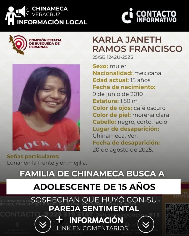 Chinameca, Ver. Desde el miércoles 20 de agosto, Carla Janeth Ramos Francisco, de 15 años, permanece desaparecida. Sus familiares creen que la menor habría abandonado su hogar para irse con su pareja sentimental, un hombre de 27 años.