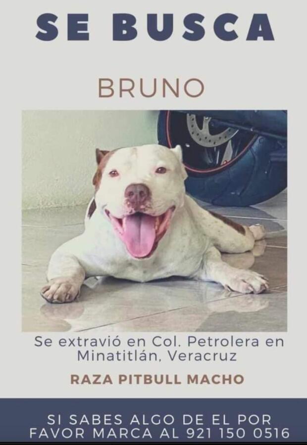 Minatitlán, Veracruz – Han pasado 10 meses desde la desaparición de «Bruno», un perro pitbull de 10 años, color blanco con manchas café, en la colonia Petrolera. A pesar del tiempo, la familia de Bruno no pierde la esperanza de recuperarlo.