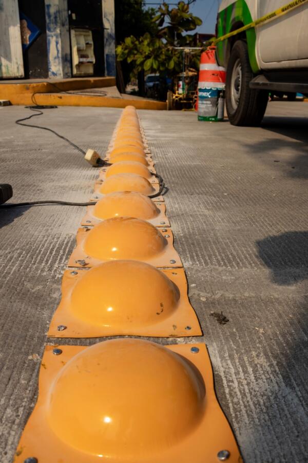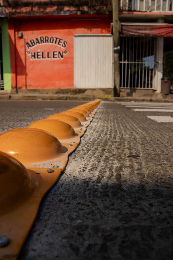 El Departamento de Tránsito y Vialidad llevó a cabo la colocación de 76 boyas metálicas y la marcación del paso peatonal con pintura termoplástica en la calle Carrillo Puerto con cruce callejón Alta Tensión y calle Niños Héroes, en la colonia 16 de Septiembre, a la altura del salón “La Finca”.