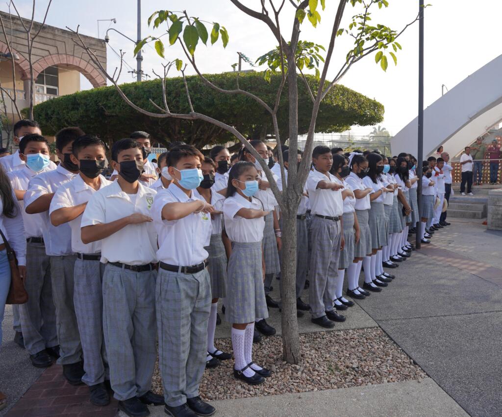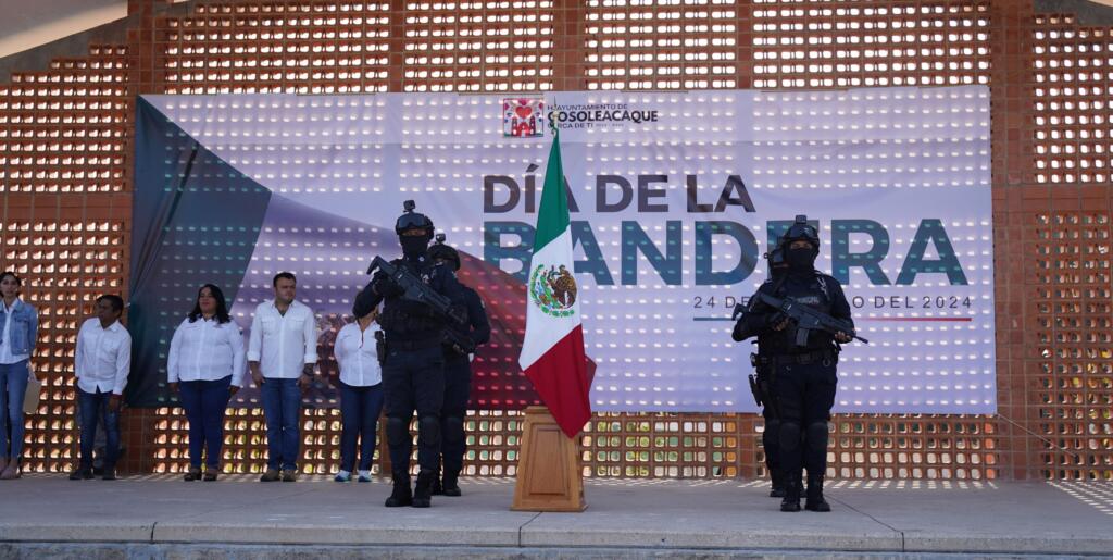 Con un acto cívico y guardias de honor, el cabildo, empleados municipales del H. Ayuntamiento de Cosoleacaque, encabezado por el alcalde Ponciano Vázquez Parissi, alumnos y padres de familia de la escuela telesecundaria “Venustiano Carranza”, de la cabecera municipal, conmemoraron el Día de la Bandera, símbolo patrio que nos da identidad y orgullo.