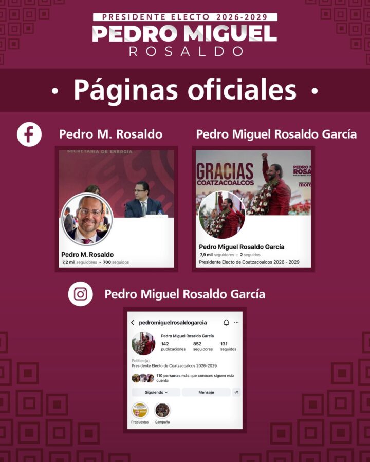 Las únicas páginas oficiales de Facebook e Instagram son: Pedro M. Rosaldo (página personal) y Pedro Miguel Rosaldo García (fan page).