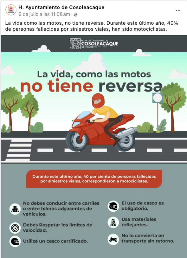 Cosoleacaque La vida como las motos, no tiene reversa. Durante este último año, 40% de personas fallecidas por siniestros viales, han sido motociclistas. Published 2 años ago on 6 julio 2024 By delinarva Related Topics:
