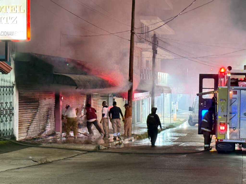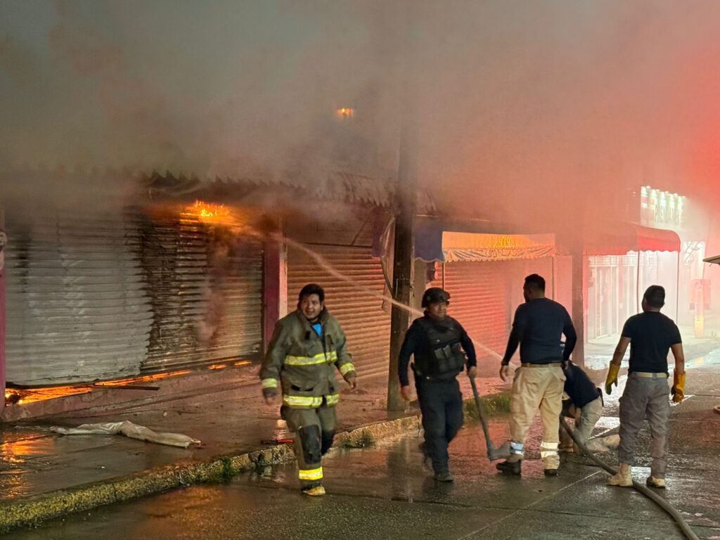 Acayucan, Ver.- El hecho sobre la calle Hidalgo esquina Javier Mina, alrededor de las 12 de la noche con 30 minutos, se presume que el artefacto casero fue arrojado contra la cortina de metal, y la gasolina logró entrar por la parte de abajo, y al haber productos de plástico así como mochilas y juguetes el fuego se extendió rápidamente, pese a la respuesta de Bomberos y Protección Civil de Acayucan, el local y toda la mercancía fue consumida por el fuego y reducía a cenizas.