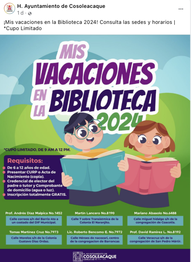 Cosoleacaque ¡Mis vacaciones en la Biblioteca 2024! Consulta las sedes y horarios | *Cupo Limitado Published 2 años ago on 22 julio 2024 By delinarva A Related Topics: