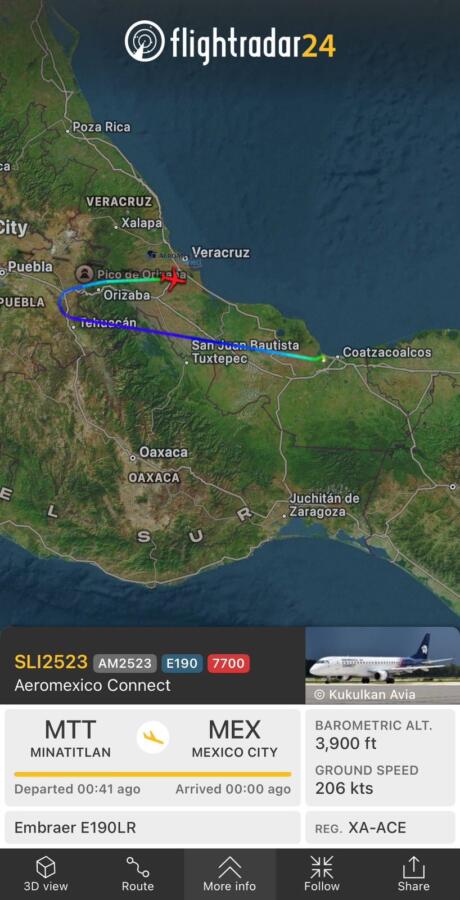 De acuerdo con Flightradar 24, la aeronave se desvió cerca de Orizaba, cerca del estado de Puebla, regresando al aeropuerto Heriberto Jara en el puerto de Veracruz.