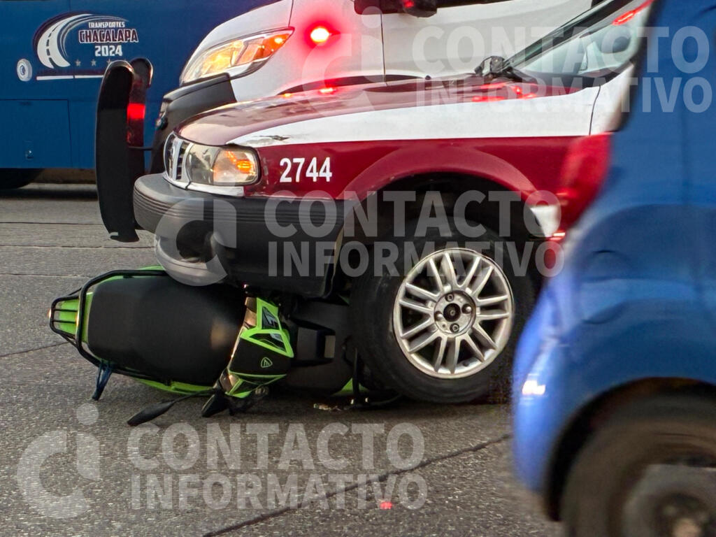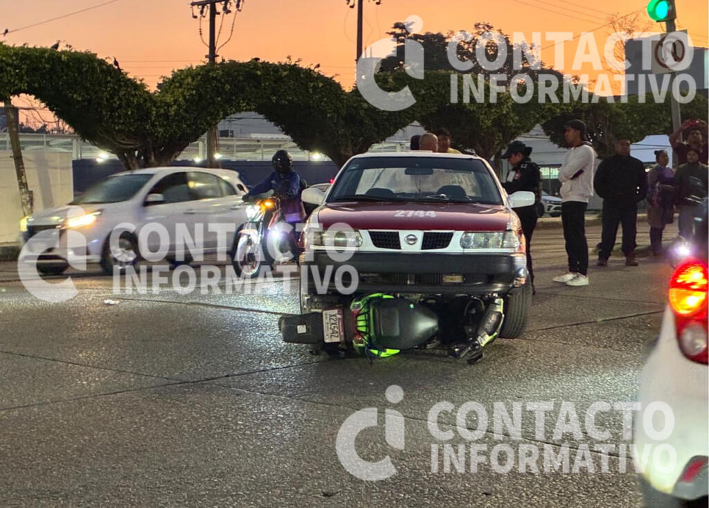 Minatitlán, Ver. Una mujer que viajaba en motocicleta terminó involucrada en un accidente vial al quedar su unidad debajo del taxi marcado con el número 2744, presuntamente al intentar incorporarse de forma repentina a otra vía.
