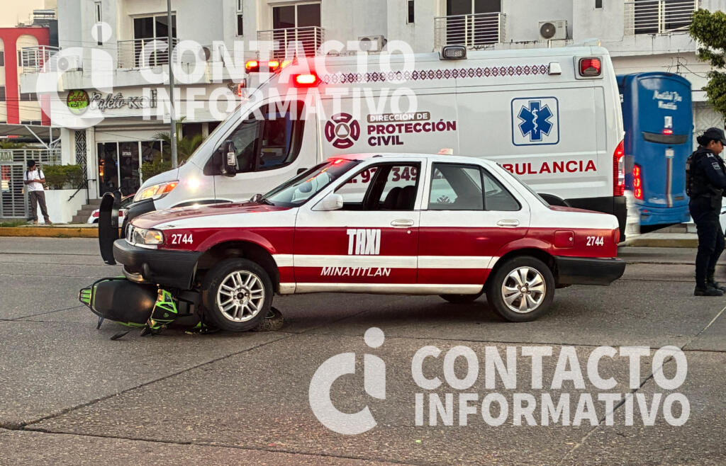 Minatitlán, Ver. Una mujer que viajaba en motocicleta terminó involucrada en un accidente vial al quedar su unidad debajo del taxi marcado con el número 2744, presuntamente al intentar incorporarse de forma repentina a otra vía.