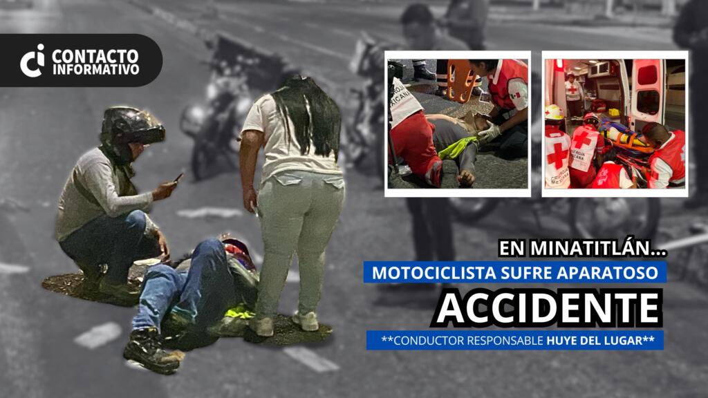 Minatitlán, Ver. Un motociclista resultó lesionado luego de ser embestido por el conductor de una camioneta, quien tras el impacto se dio a la fuga, dejando en la escena parte de la fascia de su vehículo.