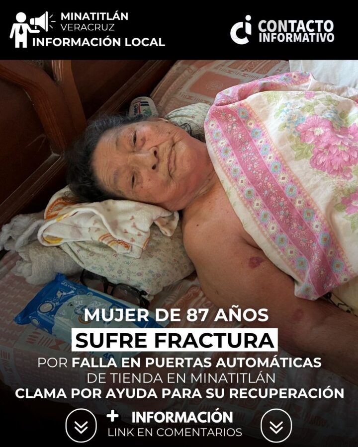 Minatitlán, Ver.- María Piedad Muñoz Castellanos, de 87años, es la mujer de la tercera edad que el pasado lunes 14 sufrió una aparatosa caída, consecuencia de probable falla en el sistema de puertas automáticas de conocida tienda comercial en Minatitlán, Ver., acabando con fractura en fémur. Aunque la aseguradora de la firma comercial, se hizo cargo de la operación correspondiente, la dejaron a la deriva, en medio de una costosa y dolorosa recuperación.
