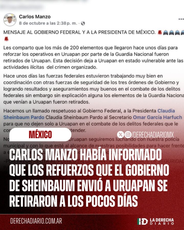 En aquel mensaje, Manzo reconoció el trabajo coordinado de las fuerzas federales con los tres órdenes de gobierno y los resultados obtenidos en el combate a delitos de alto impacto. Sin embargo, lamentó que, sin explicación pública, los elementos fueran retirados, por lo que hizo un llamado respetuoso a la presidenta Claudia Sheinbaum y al secretario de Seguridad, Omar García Harfuch, para que no dejaran solo a Uruapan en la lucha contra la violencia.