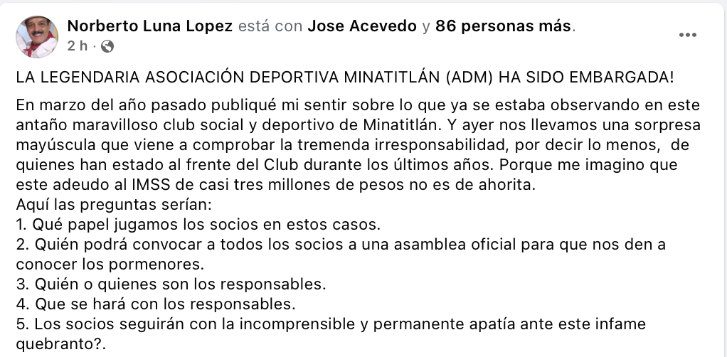 En marzo del año pasado publiqué mi sentir sobre lo que ya se estaba observando en este antaño maravilloso club social y deportivo de Minatitlán. Y ayer nos llevamos una sorpresa mayúscula que viene a comprobar la tremenda irresponsabilidad, por decir lo menos, de quienes han estado al frente del Club durante los últimos años. Porque me imagino que este adeudo al IMSS de casi tres millones de pesos no es de ahorita.