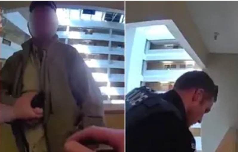 En la grabación se puede observar el momento en el que uno de los policías que participaban en la agresión abre la puerta y el sospechoso saca un arma.