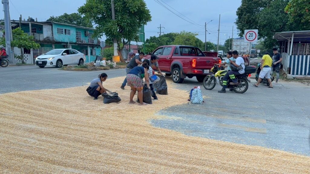 Varias toneladas de maíz amarillo fue rapiñado por habitantes de la colonia Frutos de la Revolución, taxistas y conductores de Coatzacoalcos, justo en la portada sur de la Administración del Sistema Portuario Nacional (ASIPONA).