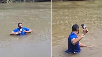 El periodista Lenildo Frazão decidió meterse a las aguas del río Mearim, ubicado en Bacabal, donde 24 horas antes se reportó la desaparición de la pequeña, para demostrar la profundidad del mismo.