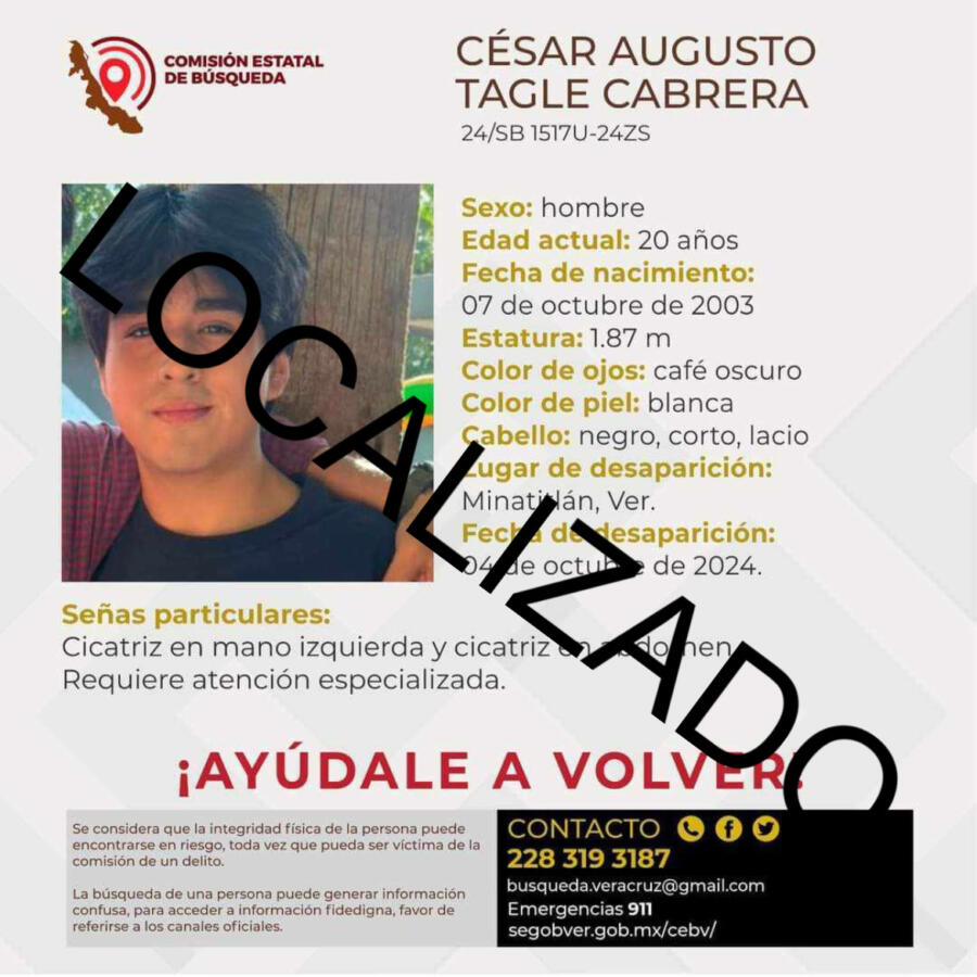 Minatitlán, Ver. Fue localizado César Augusto Tagle Cabrera, originario de Cadereyta Nuevo León, mismo que el fin de semana fue reportado como desaparecido cuándo se encontraba de visita por Minatitlán.