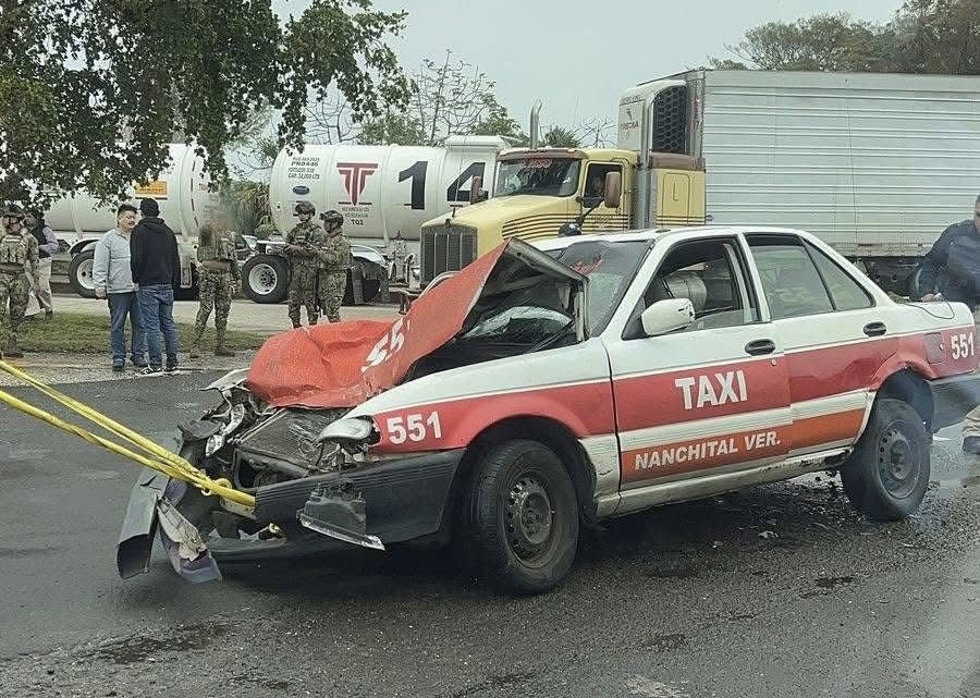 El conductor de un taxi de Nanchital se estrelló contra un tráiler y su tanque cisterna en la carretera Coatzacoalcos – Villahermosa a la altura de la Terminal Logística Marítima de Pajaritos.