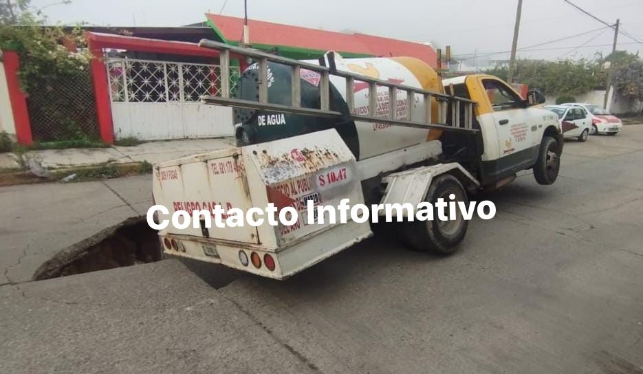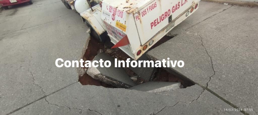 Un camión dedicado a la venta de gas LP, cayó en un socavón en la colonia Insurgentes Norte.