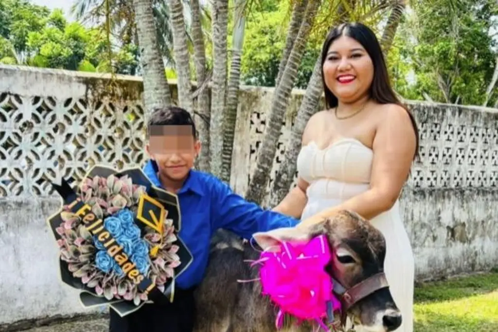 El joven Eliel Yépez Rosas se graduó de sexto grado de la primaria Francisco I. Madero de la localidad del Zapote, municipio de Alvarado, por lo que para celebrar este logro su madrina, Yenny Aylin Gómez Chávez le dio un becerro como regalo.