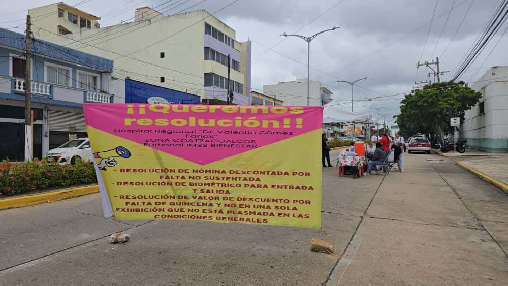 Por segundo día consecutivo, personal de enfermería del Hospital Regional Valentín Gómez Farías del programa IMSS-Bienestar en Coatzacoalcos se manifestó fuera de las instalaciones para exigir la devolución de descuentos “injustificados” aplicados en sus nóminas.