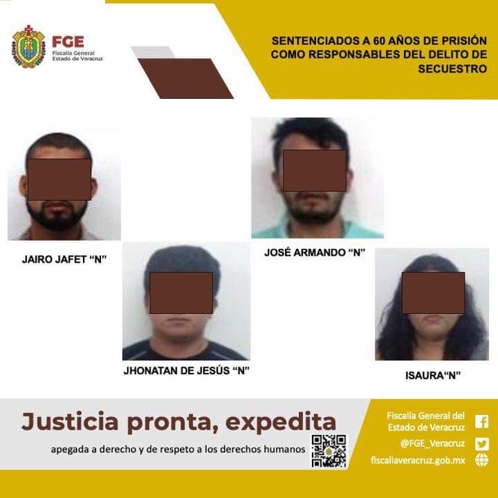 Xalapa, Ver., 21 de octubre del 2024.-La Fiscalía General del Estado, a través de la Unidad Especializada en Combate al Secuestro, logró sentencia condenatoria de 60 años de prisión en contra de Jairo Jafet “N”, Jhonatan de Jesús “N”, José Armando “N” e Isaura “N” como responsables del delito de secuestro, cometido en agravio de la víctima identificada con las iniciales L.J.B.P.