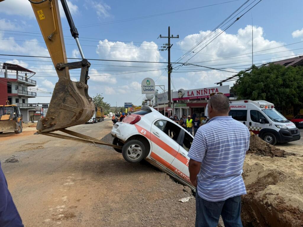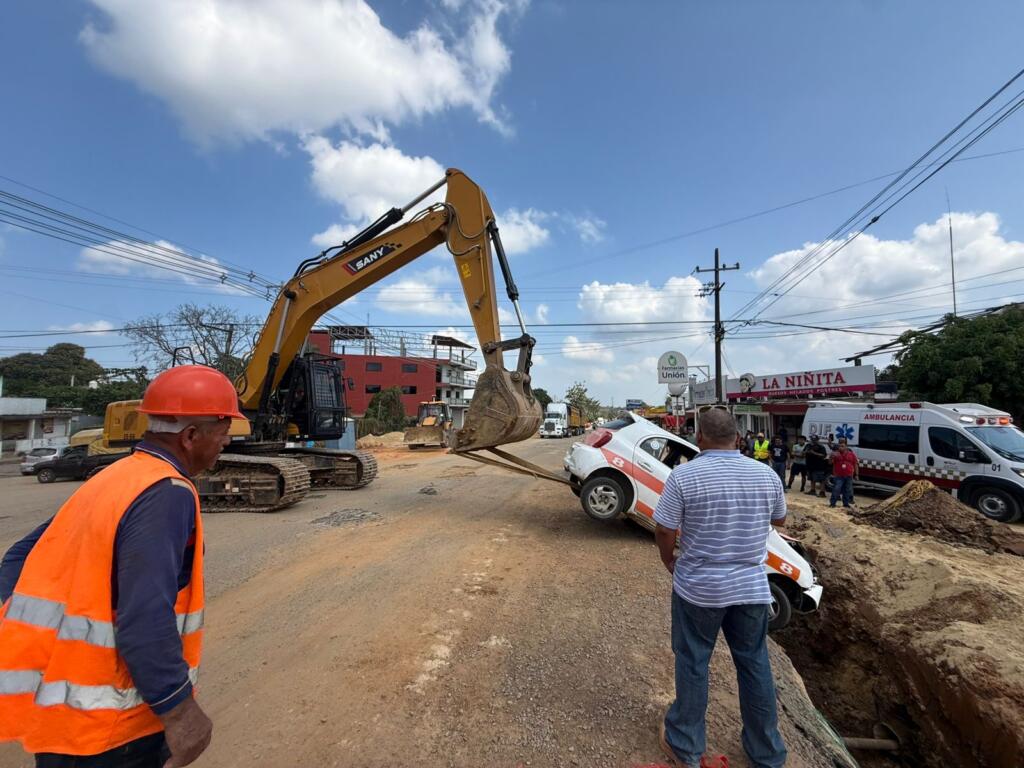 Al punto arribó personal de Protección Civil de Acayucan, mientras que una máquina 320 de la misma obra, fue movida al punto del accidente, y sacó la unidad de taxi, para luego ser orillada a la banqueta.