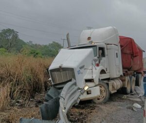 Cosoleacaque, Ver. Severos daños materiales dejó la colisión que provocó el chofer de un tráiler, que remolcaba una góndola la tarde de este miércoles a la altura del kilómetro 32 + 105 de la autopista Cosoleacaque- Acayucan.