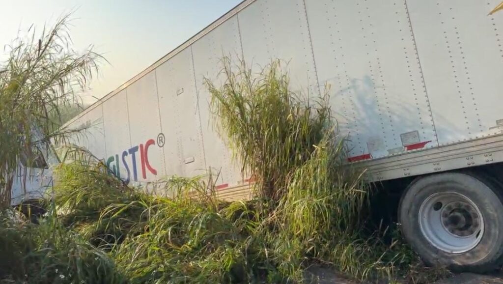 El incidente se registró cerca de las 5:30 horas, cuando una unidad de carga perteneciente a la empresa Euro Logístic sufrió una salida de camino y terminó dentro de una zona pantanosa, quedando parte de su plataforma atravesada sobre la vía federal.