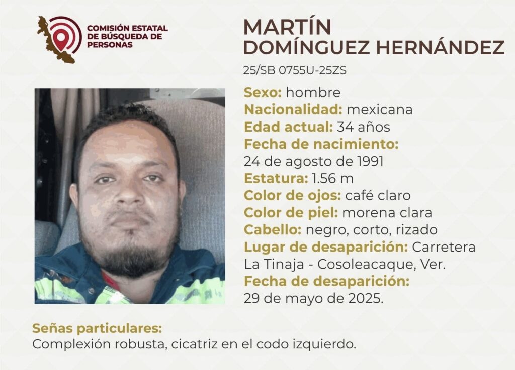 Cosoleacaque, Ver. Un transportista originario del sur de Veracruz se encuentra en calidad de desaparecido desde hace dos días, luego de emprender un viaje de trabajo que nunca concluyó. Se trata de Martín Domínguez Hernández, operador de la empresa SIMSA, quien fue visto por última vez a bordo de un tractocamión con destino a Tierra Blanca, saliendo desde el puerto de Coatzacoalcos.