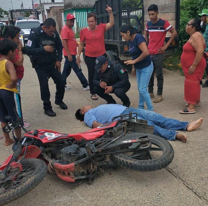 Cosoleacaque, Ver. Un aparatoso accidente de tránsito se registró la tarde de este miércoles 6 de agosto en la colonia Francisco I. Madero del municipio de Cosoleacaque, Veracruz. Una camioneta de redilas y un motociclista colisionaron en la esquina de las calles Guillermo Prieto y Constitución, cerca del pozo elevado, dejando al conductor de la moto con graves golpes y lesiones.